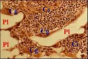 Outre les cellules habituellement présentes dans le conjonctif de caisse, le stroma peut renfermer des éléments allongés, isolés ou réunis en faisceaux, ayant l'aspect de fibroblastes mais exprimant non seulement la vimentine mais aussi l'actine musculaire lisse (A.M.L.) comme la paroi des capillaires sanguins. Ils peuvent donc être interprétés comme des myofibroblastes dont la présence dans la caisse (anciens greffons veineux) lors de la chirurgie de l'otospongiose a été d'ailleurs démontrée[7]).