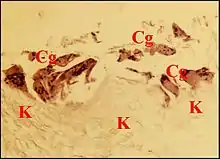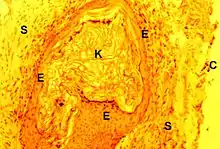 Il est une entité microscopique réelle due à l'implantation de matériel corné dans le stroma où il suscite une réaction macrophagique et gigantocellulaire. Avant l'étude de Lopez & al[2],[3] cette lésion n’est pas mentionnée dans la littérature ou seulement signalée au passage sans qu’un lien direct ne soit établi avec le cholestéatome. Le granulome à kératine peut fort bien être rattaché à une série d'affections cutanées de l'oreille externe , disparates mais comportant toujours une réaction macrophagique anti-kératine : granulome par aérateur (Hawke & Jahn, 1988)[19], kératose obturante, kystes épidermique et trichilemmal rompus dans le derme, poil inclus, follicule distendu par un comédon et même, pilomatrixome ou épithélioma momifié de Malherbe.