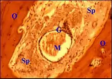 Il s'agit de spicules irréguliers d'os nécrobiotique trouvés dans des cholestéatomes récidivés. Ces esquilles sont incluses en plein stroma, à distance des osselets, mais peuvent cependant soulever l’épithélium malpighien sus-jacent. Elles peuvent y susciter une réaction fibro-inflammatoire parfois accompagnée de cellules géantes d’aspect ostéoclastique et, dans certains cas, une ossification métaplasique secondaire évocatrice de tympanosclérose sur le plan clinique uniquement.