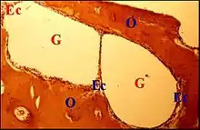 Dans les osselets normaux, les espaces périvasculaires, en continuité avec le stroma de la muqueuse, et les cavités médullaires centrales, non élargis sont seulement occupés par un tissu conjonctif peu abondant avec quelques adipocytes. L'os périosté et endochondral adjacent montre des systèmes haversiens bien formés et non modifiés.