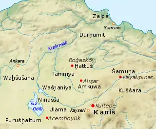 Quoi qu'il en soit de leurs origines, les premiers Hittites connus par les textes sont identifiés au début du IIe millénaire av. J.-C. dans les archives des marchands assyriens venus commercer en Anatolie centrale, où ils établissent plusieurs comptoirs, le plus important étant celui de Kanesh (l'actuel site de Kültepe) où la plupart de leurs tablettes qui nous sont connues ont été exhumées[16]. Leur étude a révélé la présence de plusieurs principautés se partageant l'Anatolie centrale au XIXe siècle avant notre ère : au nord le Hatti (autour de Hattusa, alors appelée Hattush) et Zalpa (près de la mer Noire), au sud Burushattum (Purushanda dans les textes hittites des périodes suivantes, peut-être sur le site d'Acemhöyük), Wahsusana, Mama et surtout Kanesh (plus tard Nesa), qui se situe apparemment dans la zone où les Hittites sont le plus concentrés. L'importance de cette ville pour les origines hittites transparaît dans le fait que c'est à partir de son nom que ce peuple appelait sa propre langue (nesili ou nesumnili, « langue de Nesa »)[17]. La première dynastie hittite à exercer une hégémonie sur l'Anatolie centrale vient de la cité de Kussar(a), dont la localisation reste inconnue. Elle s'affirme sous l'impulsion de deux rois, au début du XVIIIe siècle : Pithana et son fils Anitta, qui établissent leur capitale à Kanesh. Les autres principaux États anatoliens (Burushattum, Hatti et Zalpa) sont alors soumis[18],[19]. Cette dynastie ne survit pas longtemps à Anitta et s'effondre dans des conditions indéterminées.