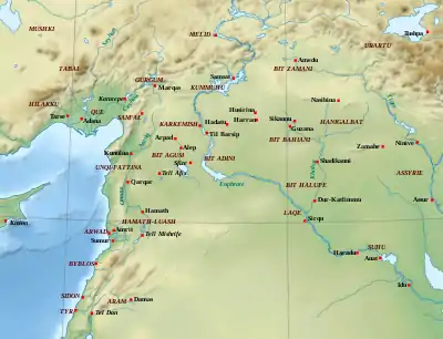 Le paysage ethnique et politique de l'Anatolie et de la Syrie est profondément bouleversé entre la fin du IIe millénaire et le début du Ier millénaire. La langue hittite n'est plus pratiquée, les royaumes successeurs du grand royaume hittite conservant pour les inscriptions officielles le seul usage des « hiéroglyphes hittites » qui transcrivent en fait du louvite. L'ancien pays du Hatti est désormais occupé par les Phrygiens nouvellement arrivés, qu'il faut peut-être identifier aux Mouchki évoqués dans les textes assyriens. Ces derniers emploient encore le terme Hatti, mais pour désigner la Syrie et l'Anatolie du sud-est où sont établis les royaumes que l'on qualifie aujourd'hui de « Néo-hittites » parce qu'ils s'inscrivent dans la continuité des traditions hittites (idéologie royale, écriture, art, religion, etc.) tout en élaborant une culture originale, les Assyriens et les Babyloniens de cette période désignant d'ailleurs la région syro-anatolienne par le terme Hatti[45]. Ils sont représentés par les deux branches descendant des rois hittites à Karkemish et Melid, ainsi que d'autres dynasties au Gurgum, Kummuhu, Que, Unqi/Pattina ou encore au Tabal, voire à Alep. La majeure partie de la Syrie passe cependant sous la coupe d'une population dirigeante de langue sémite, qui a émergé durant la période de crise, les Araméens (à Sam'al, Arpad, Hamath, Damas, Til Barsip, etc.). Il faut considérer que les royaumes néo-hittites et araméens sont des mosaïques ethniques et culturelles mêlant éléments araméens et louvites, entre autres. Ces différents États sont confrontés à partir du IXe siècle à l'expansion de la puissance assyrienne, à laquelle ils tentent tant bien que mal de résister, sollicitant parfois l'appui d'une nouvelle puissance issue de l'Anatolie orientale, l'Urartu. Ils seront définitivement submergés et annexés par l'empire assyrien durant la seconde moitié du VIIIe siècle[46].