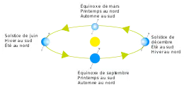 L'orbite de la Terre n'est pas parfaitement circulaire, mais légèrement excentrique. Le périhélie terrestre est atteint peu après le solstice de décembre, c'est-à-dire pendant la période hivernale dans l'hémisphère nord. Près du périhélie, en accord avec la deuxième loi de Kepler, la Terre parcourt plus rapidement son orbite qu'à l'aphélie ; en conséquence, l'hiver est légèrement plus court que l'été dans l'hémisphère nord. Finalement, le minimum de température n'est pas au moment du solstice mais un peu plus tard, ce retard saisonnier est dû à l'inertie thermique du sol et de l'océan.