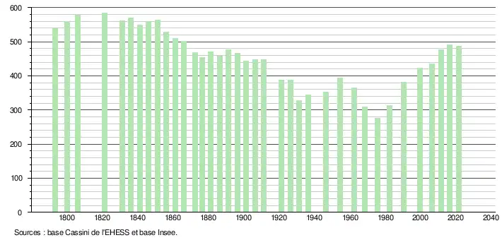L'évolution du nombre d'habitants est connue à travers les recensements de la population effectués dans la commune depuis 1793. Pour les communes de moins de 10 000 habitants, une enquête de recensement portant sur toute la population est réalisée tous les cinq ans, les populations légales des années intermédiaires étant quant à elles estimées par interpolation ou extrapolation[22]. Pour la commune, le premier recensement exhaustif entrant dans le cadre du nouveau dispositif a été réalisé en 2006[23].