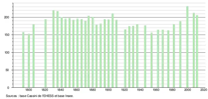 L'évolution du nombre d'habitants est connue à travers les recensements de la population effectués dans la commune depuis 1793. À partir du , les populations légales des communes sont publiées annuellement dans le cadre d'un recensement qui repose désormais sur une collecte d'information annuelle, concernant successivement tous les territoires communaux au cours d'une période de cinq ans. Pour les communes de moins de 10 000 habitants, une enquête de recensement portant sur toute la population est réalisée tous les cinq ans, les populations légales des années intermédiaires étant quant à elles estimées par interpolation ou extrapolation[4]. Pour la commune, le premier recensement exhaustif entrant dans le cadre du nouveau dispositif a été réalisé en 2007[5],[Note 1].