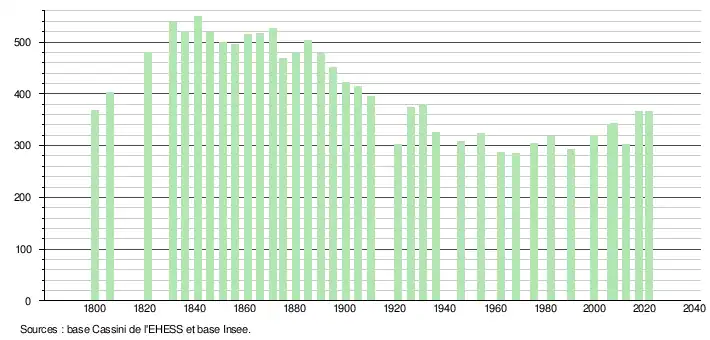 L'évolution du nombre d'habitants est connue à travers les recensements de la population effectués dans la commune depuis 1800. Pour les communes de moins de 10 000 habitants, une enquête de recensement portant sur toute la population est réalisée tous les cinq ans, les populations légales des années intermédiaires étant quant à elles estimées par interpolation ou extrapolation[32]. Pour la commune, le premier recensement exhaustif entrant dans le cadre du nouveau dispositif a été réalisé en 2007[33].