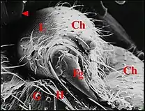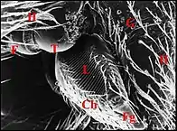 Holocnemus pluchei possède un appareil stridulatoire découvert par Lopez en 1988[11] dans des coupes histologiques et au microscope électronique à balayage et décrit aussi par Huber en 1995[12] qui ne cite pas le précédent dans sa bibliographie. Différent de celui des Argyrodes (Theridiidae), cet appareil, présent dans les deux sexes et même chez les immatures, se compose d'un "archet" constitué par un tubercule trochantérien du pédipalpe, et d'une "lyre" située sur la tige chélicérienne (Fig.3 à 5).