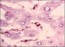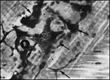 Holocnemus pluchei montre sur sa face ventrale une bande noire longitudinale caractéristique étendue du labium aux filières (Fig.1). Cette marque est en rapport avec une étrange pigmentation interne mise en évidence par Lopez et Legendre en 1975[9], liée à la présence de cellules particulières rameuses, plus ou moins stellaires, les chromatophores, chargées de granulations brunâtres, s'insinuant jusque dans les muscles (Fig.2). La nature chimique et la signification du pigment sont imprécises. Pareilles cellules n'ont pas été retrouvées chez les autres Araignées où une pigmentation profonde est toutefois possible (Diguetidae)[10].