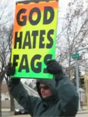 Aux États-Unis, le révérend homophobe Fred Phelps[40] a créé un groupe activiste religieux qui compte une centaine de membres, la Westboro Baptist Church, fondée sur une théologie anti-homosexuelle et essentiellement composée de proches du fondateur[41].