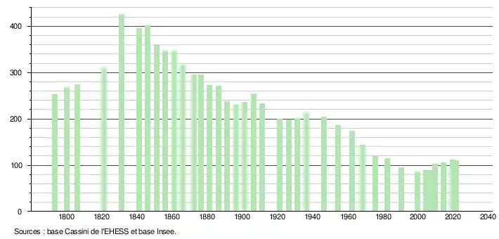 L'évolution du nombre d'habitants est connue à travers les recensements de la population effectués dans la commune depuis 1793. Pour les communes de moins de 10 000 habitants, une enquête de recensement portant sur toute la population est réalisée tous les cinq ans, les populations légales des années intermédiaires étant quant à elles estimées par interpolation ou extrapolation[28]. Pour la commune, le premier recensement exhaustif entrant dans le cadre du nouveau dispositif a été réalisé en 2004[29].