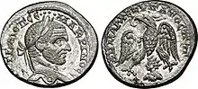 Toutefois, Azize est présenté dans les Antiquités judaïques de Flavius Josèphe (20.7.1) comme ayant été roi « d'Émèse » vers l'an 53 apr. J.-C., et avant lui un autre Sampsigéram (18.5.4). Selon Pline l'Ancien, le territoire d'Émèse (aussi appelé « l'Émésène »[36]) confinait à celui de Palmyre[37][alpha 4]. La principauté fut finalement annexée par Rome, très probablement entre 72 et la date de la construction du mausolée d'Émèse (78-79) d'après Maurice Sartre, à la province de Syrie[27]. Émèse commença à frapper monnaie sous le règne d'Antonin le Pieux (r. 138-161)[10]. Or, d'après Carlos Chad, « les premières représentations monétaires qui nous soient parvenues de la pierre noire d'Emèse appartiennent à une frappe d'Antonin le Pieux et se prolongent dans les émissions de Marc Aurèle[41]. » « Les renseignements que nous fournissent » ces monnaies attestent le culte d'une « pierre conique », que Carlos Chad a expliqué être un bétyle du soleil « dont le culte à Emèse doit être bien antérieur[42] ». Carlos Chad a en outre fait remarquer que « sur le monnayage de Marc Aurèle, c'est le bétyle qui est représenté » et non pas un temple[42] — le « temple lui-même n'apparaît que dans les monnaies éméséniennes de Julia Domna et de Caracalla[41] » ; partant de cet indice, il a émis l'hypothèse d'une construction tardive, « c'est-à-dire sous les Sévères », du temple décrit par Hérodien comme ayant contenu la pierre à Émèse au temps de l'exercice par Héliogabale et par le cousin de celui-ci de la prêtrise du culte du soleil (ou « Élagabal »)[42],[43]. D'après Carlos Chad,
