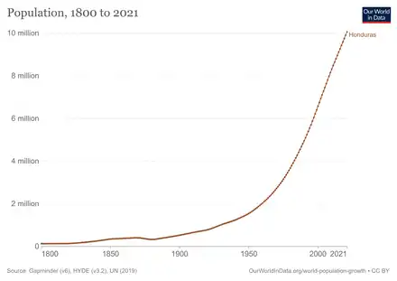 Le Honduras compte 9,3 millions d'habitants (appelés Honduriens) en juin 2020[28]. La population se compose de 90 % de métis (Hispaniques et Indigènes), 7 % d'Indigènes purs, 2 % de Noirs (Garifuna), et 1 % de Blancs.