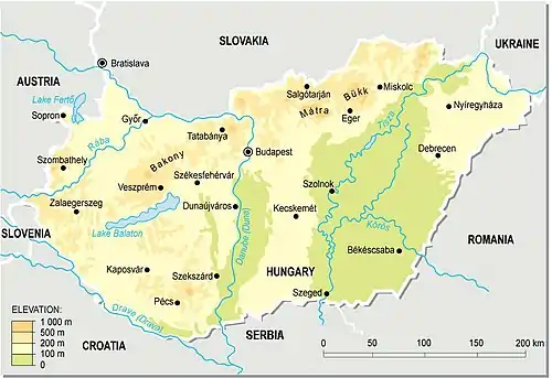 La Hongrie présente une altitude moyenne de 200 mètres. Bien qu'il existe quelques sommets montagneux, seuls 2 % du territoire national dépassent les 300 m d'altitude. Le point culminant de la Hongrie est le Kékes dans les monts Mátra qui culmine à 1 014 mètres. Le point le plus bas est situé à Csongrád-Csanád près de la rivière Tisza à 77,6 m de hauteur. Les principales rivières du pays sont le Danube et la Tisza, dont 444 km sont navigables. Les affluents mineurs du Danube se trouvent aux abords de la frontière croate : il s'agit de la Drave, du Raab, du Someș, du Sió et de la frontière slovaque : l'Ipeľ.