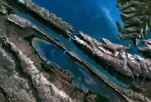 Image satellite de la baie de Talbot avec les deux parties des Horizontal Falls.