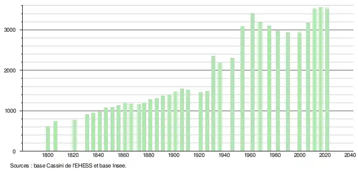 L'évolution du nombre d'habitants est connue à travers les recensements de la population effectués dans la commune depuis 1800. Pour les communes de moins de 10 000 habitants, une enquête de recensement portant sur toute la population est réalisée tous les cinq ans, les populations légales des années intermédiaires étant quant à elles estimées par interpolation ou extrapolation[39]. Pour la commune, le premier recensement exhaustif entrant dans le cadre du nouveau dispositif a été réalisé en 2006[40].