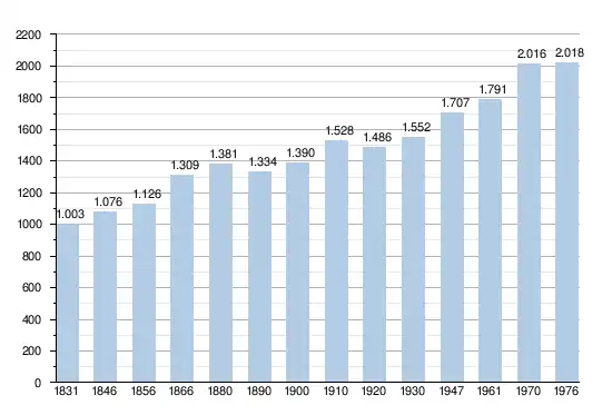 Les chiffres des années 1831 à 1970 tiennent compte des chiffres des anciennes communes fusionnées.