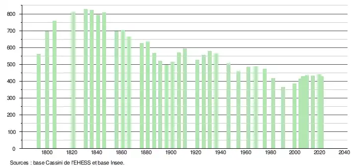 L'évolution du nombre d'habitants est connue à travers les recensements de la population effectués dans la commune depuis 1793. Pour les communes de moins de 10 000 habitants, une enquête de recensement portant sur toute la population est réalisée tous les cinq ans, les populations légales des années intermédiaires étant quant à elles estimées par interpolation ou extrapolation[17]. Pour la commune, le premier recensement exhaustif entrant dans le cadre du nouveau dispositif a été réalisé en 2004[18].