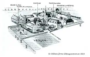 - René Pède, « Braine-l'Alleud et Bois-Seigneur-Isaac, Chapelles domestiques sous l’Ancien Régime : la chapelle castrale du Goumont », Revue d’histoire religieuse du Brabant wallon, Namur, Centre d'histoire religieuse des Facultés universitaires Saint-Louis, vol. 16, no 1, , p. 218-238 (lire en ligne [PDF]) Le nom « Château d’Hougoumont » est inscrit au centre du plan, juste à gauche des bâtiments.