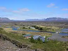 Vue de la partie septentrionale des Þingvellir avec au premier plan la Öxará dominés à droite par la Hrafnabjörg, à gauche par l'Ármannsfell ; au dernier plan à gauche se trouve le Skjaldbreiður.