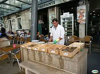 Bar à huîtres (en) avec son étal et son banc d'écaillage. L'emballage des huîtres (cagette ou bourriche ronde en bois de peuplier[59]) porte une étiquette indiquant la dénomination de vente, le nom ou la raison sociale et l'adresse de l'expéditeur. Plus récemment a été développé un autre emballage en carton recyclable[60].