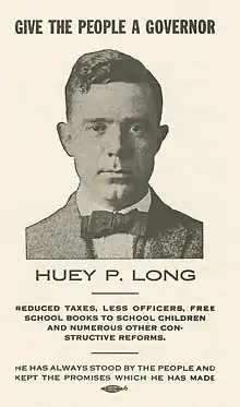 Huey Pierce Long Junior, surnommé « The Kingfish », né le à Winnfield et mort assassiné le à Baton Rouge, est un homme politique américain, populiste de gauche[1]. Démocrate sudiste, il fut gouverneur de Louisiane de 1928 à 1932 et sénateur de ce même État au Congrès des États-Unis de 1932 à 1935. Leader charismatique devenu une légende en Louisiane en sa qualité de défenseur des pauvres, sa gouvernance fut néanmoins caractérisée par une forte propension à l'autoritarisme, la corruption et la démagogie.