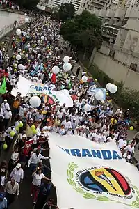 Le , Hugo Chávez annonce, à la télévision, le licenciement des cadres dirigeants de la compagnie pétrolière PDVSA. S'ensuit une intensification des manifestations de l'opposition. Le 9 avril, les syndicats CTV et Fedecámaras annoncent une grève générale de 24 heures pour soutenir les dirigeants licenciés. L'opposition convoque une manifestation le 11 avril et réussit à regrouper plus de 200 000 personnes[38]. Cette manifestation est au départ prévue et autorisée jusqu'au siège de PDVSA, situé dans le secteur de Chuao, vers l'est de Caracas, mais sur un appel à « marcher sur Miraflores », elle est déviée vers le palais présidentiel, où a lieu le rassemblement pro-Chávez[39]. Lorsque la manifestation atteint le centre-ville, de violents affrontements éclatent. Le maintien de l'ordre est assuré, selon le secteur, par la police métropolitaine de Caracas ou par la garde nationale. Hugo Chávez, qui se trouve dans le palais, active le « plan Avila » (plan d'opérations de l'armée pour contenir des troubles à l'ordre public)[40],[41]. L'ordre n'est pas exécuté car le général Manuel Antonio Rosendo, chef du Commandement unifié de la Force armée nationale, soutient les officiers qui demandent la démission du gouvernement. Les chaînes de télévision privées émettent, le 11 avril, avec un « écran divisé », montrant sur une moitié les émissions habituelles et sur l'autre Chávez et des scènes des troubles au centre de Caracas. Le gouvernement ordonne l'arrêt des émissions, mais les chaînes réussissent à les rétablir quelques minutes plus tard.