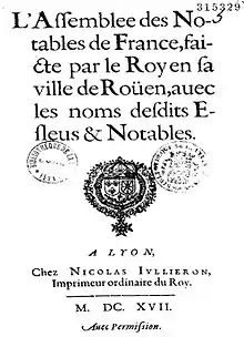 - Journal de l'Assemblée des notables convoquée à Paris en 1626... 8°. Rouen BM. Texte réédité vers 1750 en annexe aux Mémoires pour servir à l'histoire du cardinal duc de Richelieu, 8°.