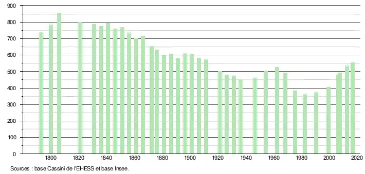 L'évolution du nombre d'habitants est connue à travers les recensements de la population effectués dans la commune depuis 1793. Pour les communes de moins de 10 000 habitants, une enquête de recensement portant sur toute la population est réalisée tous les cinq ans, les populations légales des années intermédiaires étant quant à elles estimées par interpolation ou extrapolation[9]. Pour la commune, le premier recensement exhaustif entrant dans le cadre du nouveau dispositif a été réalisé en 2007[10].