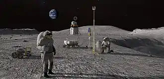 - la NASA veut lancer plusieurs missions robotiques ayant pour objectif d'effectuer une première reconnaissance. Le développement des atterrisseurs chargés de déposer ces équipements scientifiques sur la Lune est confié à l'industrie privée dans le cadre du programme Commercial Lunar Payload Services (CLPS) et fonctionne de manière analogue au programme COTS consacré au ravitaillement de la Station spatiale internationale. Trois entreprises, sont pré-sélectionnées en [29] ;