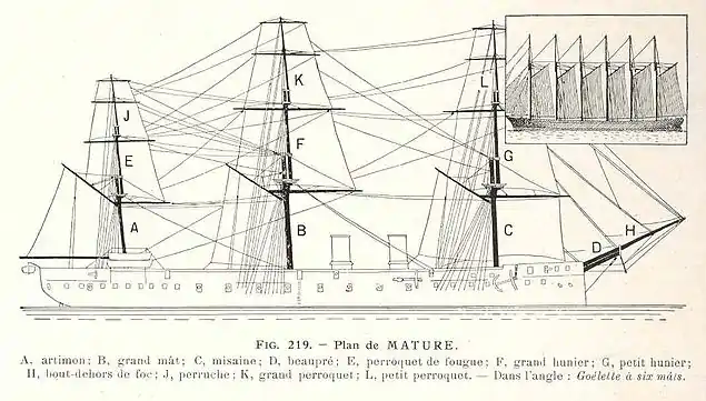 - Mât de misaine : Petit Hunier ou Hunier de misaine[2]