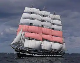 - Trois-mâts goélette ou barquentin : un mât à voiles carrées (avec huniers) et deux mâts à voiles auriques à l’arrière.