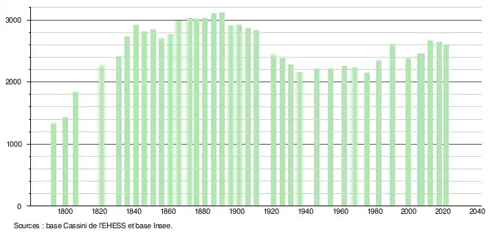 L'évolution du nombre d'habitants est connue à travers les recensements de la population effectués dans la commune depuis 1793. Pour les communes de moins de 10 000 habitants, une enquête de recensement portant sur toute la population est réalisée tous les cinq ans, les populations légales des années intermédiaires étant quant à elles estimées par interpolation ou extrapolation[25]. Pour la commune, le premier recensement exhaustif entrant dans le cadre du nouveau dispositif a été réalisé en 2007[26].