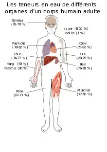 La composition du corps humain (en) montre que l'eau n'y est pas répartie uniformément, certains organes en contiennent plus que d'autres. La teneur en eau de la peau est de 67 à 73 %. La répartition de l'eau dans les couches superficielles de la peau n'est pas homogène, le gradient hydrique cutané montrant une baisse au fur et à mesure que l'on s'approche de la surface cutanée : le derme (principal réservoir d'eau — 7 à 8 kg — de la peau, qui diffuse des couches externes dermiques et gagne, après migration transépidermique, les espaces intercornéocytaires) présente une teneur en eau de l'ordre de 80 %, l'épiderme profond une teneur en eau constante de l'ordre de 70 %. Cette teneur chute à 25-30 % à l'interface couche granuleuse-couche cornée, et atteint 15-20 % dans la couche cornée d'une peau normalement hydratée[6].