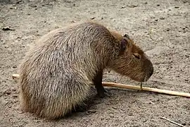 C'est le plus gros rongeur actuel. L'adulte mesure plus de 1 mètre et pèse plus de 50 kilos (jusqu'à 91 kilos pour 1,2 mètre de long et 60 centimètres de haut). Il vit en Amérique du Sud, où il mène la vie d'un mammifère social et semi-aquatique. Il nage très bien et vit en groupe, les adultes s'organisant pour garder les petits. Le capybara se nourrit surtout de plantes aquatiques (dont la jacinthe d'eau), de feuilles, d'écorce, de fruits, de roseaux et d'herbages qu'il trouve le long des lacs, rivières et marais où il vit.