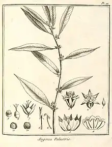 LA SAGONE aquatique. (Tabula 111.)Cette plante eſt herbacée. De la même racine s'élèvent pluſieurs tiges droites, ſimples, cylindriques, hautes de deux ou trois pieds, garnies de feuilles alternes, liſſes, vertes, ovales, preſque ſeſſiles, longues d'environ trois pouces, terminées en pointe.