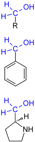 Parmi les composés chimiques les plus simples comportant un groupe hydroxyméthyle, on trouve le méthanol (H-CH2-OH) et l'éthanol (CH3-CH2-OH). Le groupe hydroxyméthyle est également la chaîne latérale de la sérine, un acide aminé protéinogène[3].