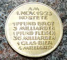 La chute du cours du mark s'accentue à partir de au moment où la conférence pour la fourniture d’un prêt par les Alliés échoue[20]. Les prêteurs étrangers sur le marché international perdent totalement confiance. Le dollar, qui s'échangeait autour de 420 marks en , grimpe à 49 000 marks en . Pendant l’année 1923, le cours du dollar par rapport au papiermark augmente ainsi de 5,79 × 1010. Le prix au détail passe de l’indice 1 en 1913 à 750 000 000 000 en . Les prix des repas servis au restaurant varient selon l’heure de la commande et l’heure à laquelle l’addition est présentée, si bien que les restaurateurs doivent offrir des plats en plus à leurs clients[21], ou leur faire payer l’addition en début de repas. Durant l'été 1923, les paysans refusent en ville d'accepter le mark-papier en échange de leurs produits agricoles[22]. Les salariés se font payer deux fois par jour, etc.