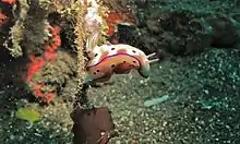 Les rhinophores sont lamellés et le bouquet branchial ont une teinte blanchâtre et sont surlignés de brun.