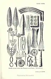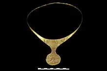 - 1900-1400 av. J.-C.[76] : culture d’Unétice en Bohême, Bavière, Allemagne, Pologne et Moravie. Unétice est le centre principal des débuts du Bronze ancien en Europe[77]. Il s’y crée les premières productions originales du monde barbare (haches à rebords, poignards triangulaires, épingles, torques), qui seront largement diffusés en Europe occidentale. Le site d’Unétice doit son importance au contrôle des gisements de cuivre (Alpes et Balkans), d’étain (Bohême) et d’or et de celui des voies commerciales de l’ambre de la mer Baltique. Les contacts avec la Méditerranée sont certains (Mycènes, Égypte, Chypre). Le culte de la déesse-mère disparaît mais subsiste le symbole des cornes, lié au développement de l’élevage. L’art reste abstrait (décorations géométriques des armes et des poteries).