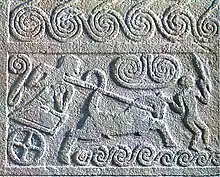 - 1800-500 av. J.-C. : âge du bronze nordique, divisé en six périodes par Oscar Montelius[79]. La représentation sur les gravures rupestres et sur les objets de bronze de navires longs, mus par des rames, sans quille et à la poupe relevée, dès le milieu du IIe millénaire av. J.-C. témoigne de la pratique de la navigation en Scandinavie[80]. Le Char solaire de Trundholm, au Danemark, daté vers 1400-1300 av. J.-C., atteste d’un culte solaire[81]. Le cheval est introduit dans les motifs décoratifs vers , en particulier sur les manches des rasoirs de bronze[82]. La culture du seigle et de l’avoine se répand.