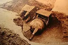 - Vers 1300-1046 av. J.-C. : les rois de la dynastie Shang installent leur capitale, Yin, près d’Anyang[56]. Les enceintes disparaissent et la fonction cultuelle et cérémonielle des villes l’emporte sur l’aspect guerrier. Les imposantes tombes royales Shang, en forme de fosses cruciformes renfermant des chars livrent des objets en bronze, en ivoire et en jade, ainsi que les restes des corps de plusieurs dizaines de morts d’accompagnement, ce qui témoigne de la puissance des rois Shang. On a découvert à Anyang les premières inscriptions chinoises sur des carapaces de tortue où des os oraculaires (Jiaguwen) qui font état des pratiques divinatoires, qui avec la production de bronze sont le fondement du pouvoir des rois Shang[53].