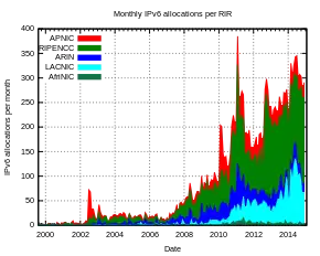 Le , l'Internet Assigned Numbers Authority (IANA) annonce que les cinq derniers blocs d'adresses ont été distribués de façon égale aux cinq registres Internet régionaux (RIR) et que, par conséquent, elle ne dispose plus de blocs d'adresses libres[11]. Le , APNIC, le RIR qui dessert la zone Asie-Pacifique, a annoncé qu'il ne disposait plus que d'un bloc /8 (16,7 millions d'adresses) et ne distribue désormais qu'une quantité limitée d'adresses aux demandeurs[12]. Le RIPE NCC, qui dessert l'Europe et le Moyen-Orient, a fait de même le [13]. Les autres RIR épuiseront les allocations d'adresses IPv4 pour les registres Internet locaux (LIR) entre 2013 et 2015. Les LIR commenceront à manquer d'adresses IPv4 à attribuer à leurs clients en 2012.