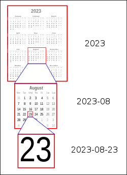 Enfin, il est également possible de remplacer les éléments tronqués par des tirets « - ». Par exemple, en omettant l'année, on noterait le ainsi : « --1202 ». On pourrait le réduire à « -1202 » sans confusion avec « 1202 » seul qui représenterait l'année 1202.