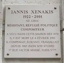 - Naturalisation faite en francisant son prénom par Jean, cf Insee, « Extrait de l'acte de décès de Jean Xenakis », sur MatchID