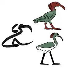 Il représente un ibis chauve (Geronticus eremita), ses couleurs changent beaucoup ; il est anciennement complètement rouge et brun et est souvent vert, à la tête rouge mais aussi parfois verte et bleue. Il est translittéré ȝḫ.
