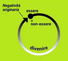 La positivité des déterminations historiques est ainsi réconciliée avec la négativité originelle du concept de soi, ou la conscience de soi du concept déterminé. L'acte de l'esprit est une « négativité originelle » dans la mesure où il se réalise au moment où il nie l'être en tant que nature (le simple « A » sans liens), c'est-à-dire qu'il nie quelque chose qui n'existe pas (que la naturalisme considère à tort comme existant), et, dans cette négation, il se réalise lui-même. L'être pur n'est rien parce que ce n'est même pas cet être conceptuel posé par la pensée abstraite qui, bien qu'inactuel, alimente la logique du concret[16].