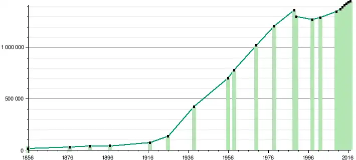 Comme presque toutes les grandes villes russes, Iekaterinbourg a connu une croissance démographique spectaculaire sous le régime soviétique passant entre 1917 et 1989 de moins de 100 000 à plus de 1,3 million d'habitants. L'éclatement de l'Union soviétique entraine en 1990 une chute de la population qui se poursuit durant quelques années. Au début des années 2000, la ville renoue avec la croissance mais l'augmentation est beaucoup plus modérée qu'avant 1990. En 2015, les naissances l'emportaient sur les décès avec 15,8 naissances contre 11,2 décès pour 1 000 personnes entrainant une augmentation naturelle de 6 749 personnes par an. Cette année-là les apports migratoires étaient encore plus importants avec un solde positif de 9 580 personnes provenant à hauteur de 54,1 % de la région de Sverdlovsk, 18,2 % d'autres régions de la Russie, le solde provenant de pays étrangers (Ukraine, Kazakhstan, etc.)[10]. En , Iekaterinbourg comptait près de 1,5 million d'habitants, en faisant la ville la plus peuplée de l'Oural et la quatrième ville la plus peuplée de Russie après Moscou, Saint-Pétersbourg et Novossibirsk.