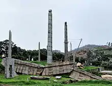 Stèles géantes d'Aksoum : obélisque d'Aksoum (au centre), stèle d'Ezana (à droite), Au sol, la grandes stèle en phonolite, brisée volontairement pendant l'antiquité, est le plus grand monolithe taillé par l'homme, haut de 32,60 mètres pour une masse de 517 tonnes.
