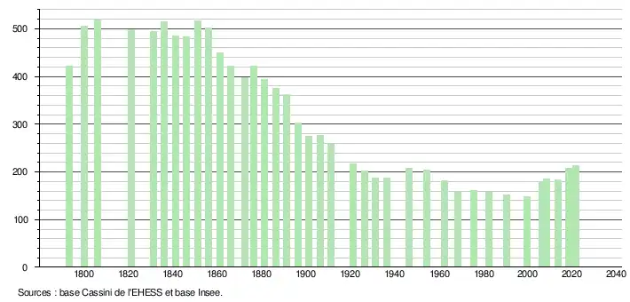 L'évolution du nombre d'habitants est connue à travers les recensements de la population effectués dans la commune depuis 1793. Pour les communes de moins de 10 000 habitants, une enquête de recensement portant sur toute la population est réalisée tous les cinq ans, les populations légales des années intermédiaires étant quant à elles estimées par interpolation ou extrapolation[21]. Pour la commune, le premier recensement exhaustif entrant dans le cadre du nouveau dispositif a été réalisé en 2008[22].