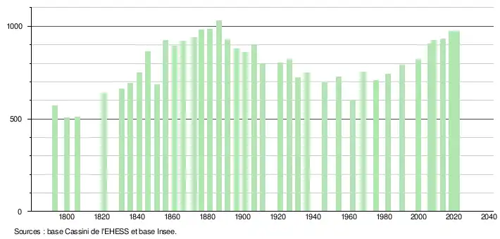 L'évolution du nombre d'habitants est connue à travers les recensements de la population effectués dans la commune depuis 1793. Pour les communes de moins de 10 000 habitants, une enquête de recensement portant sur toute la population est réalisée tous les cinq ans, les populations légales des années intermédiaires étant quant à elles estimées par interpolation ou extrapolation[43]. Pour la commune, le premier recensement exhaustif entrant dans le cadre du nouveau dispositif a été réalisé en 2008[44].